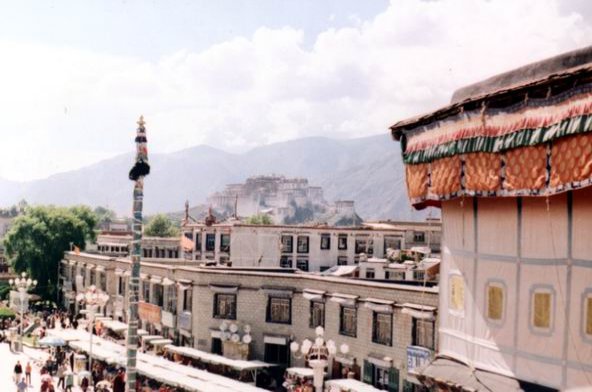 站在大昭寺顶上向远处眺望,前面便是八角(廓)街,远处布宫。